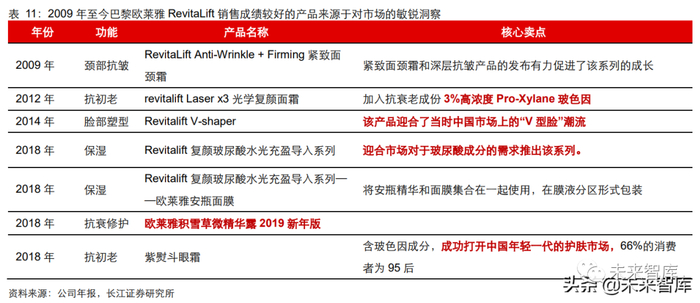 Revitalift 系列是目前巴黎欧莱雅最为畅销的产品系列之一,成功的核心在于结合当下 消费趋势的捕捉塑造产品的核心卖点,进行快速的产品迭代。在这一阶段巴黎欧莱雅结 合当下的消费趋势、市场环境对产品进行快速的迭代,以其最为畅销的 Revitalift 系列来 看,例如当年 2012 年品牌洞察到光子嫩肤成为潮流但其价格具有一定门槛性的消费痛 点,因此 Revitaift 推出光学复颜面霜,宣称效果拟合光子嫩肤技术,在中国市场销售成 绩优异;例如 2014 年在结合当下市场对 V 型脸的消费趋势下推出 Revitalift V-shaper 迎合这一客群的需求趋势,在 2018 年中国 Z 世代人群的抗初老意识逐渐形成后,推出 目前最为畅销的紫熨斗眼霜第一代(含玻色因成分),赢得了我国 Z 世代具有抗初老意 识的女性用户群体,同时顺应“安瓶”品类趋势推出了安瓶面膜,紫熨斗眼霜和安瓶面 膜,至目前仍是巴黎欧莱雅中国区知名的畅销单品。