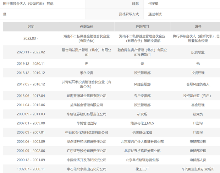何多粮早年曾在燕山石化工作,在上世纪90年代,他在化工二厂担任车间副主任和研究所长。2000年12月,并不满足一辈子待在“沟里”的他,跳到阜成门一家券商营业部,自此正式进入金融圈。