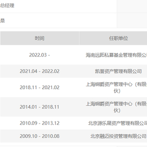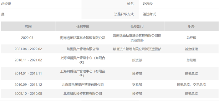 2014年,赵志俊加入上海铜爵资产管理中心(有限合伙),担任投资总监,四年后,升为投资部总经理。2021年,他加入凯誉资产管理有限公司任基金经理,这也是他“奔私”前的最后一份工作。