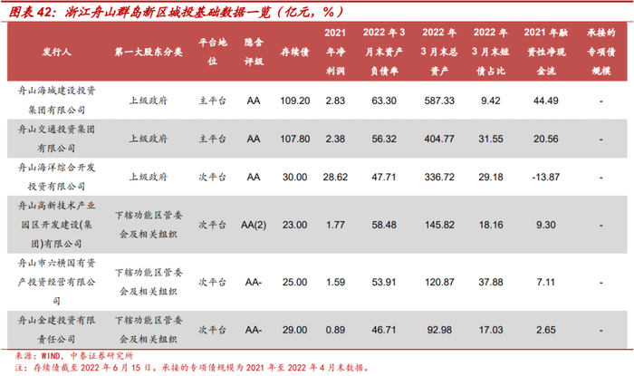 舟山群岛新区一般公共预算收入规模较高,政府性基金收入在新区中处于中等偏下水平,财政自给率较高,2020年新区及所在浙江省财政自给率分别为50.91%和71.89%。由于舟山群岛新区覆盖整个舟山市,舟山市城投以新区城投和其他区县级城投为主,相对而言,新区城投具有较高的安全边际。