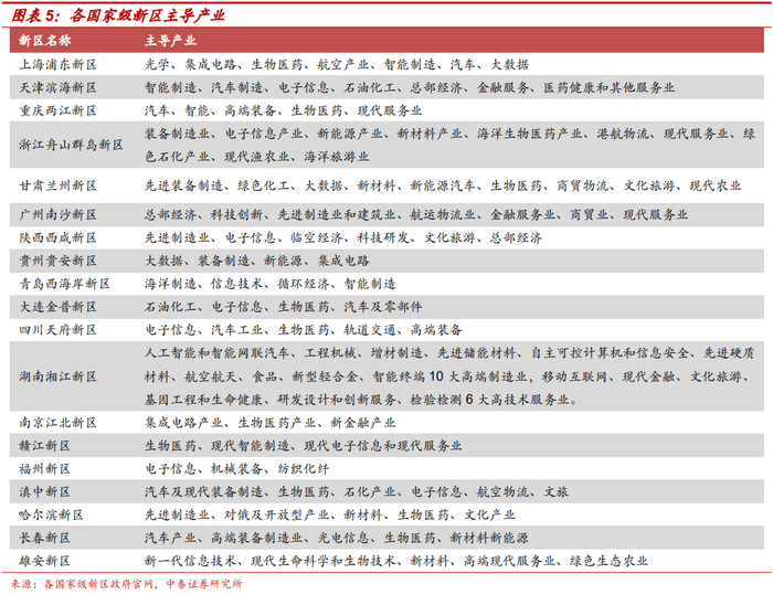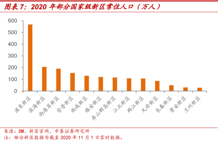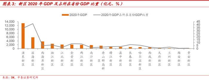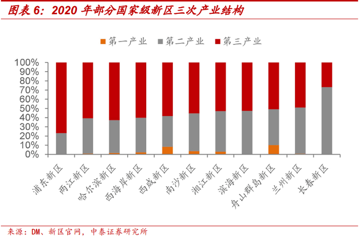 结合公开披露过产业结构的新区数据,浦东新区、两江新区、哈尔滨新区、西海岸新区以第三产业为主,滨海新区、湘江新区、兰州新区以二、三产业为主,南沙新区、舟山群岛新区、西咸新区第一产业增加值有一定规模,长春新区以第二产业为主。