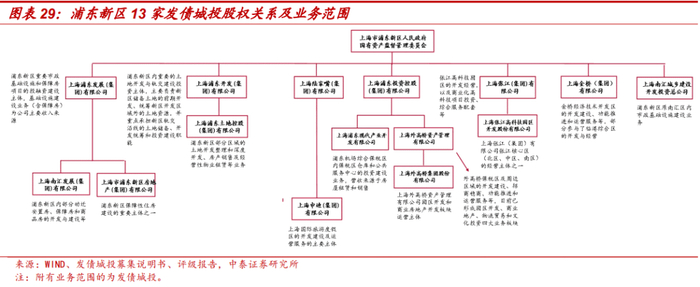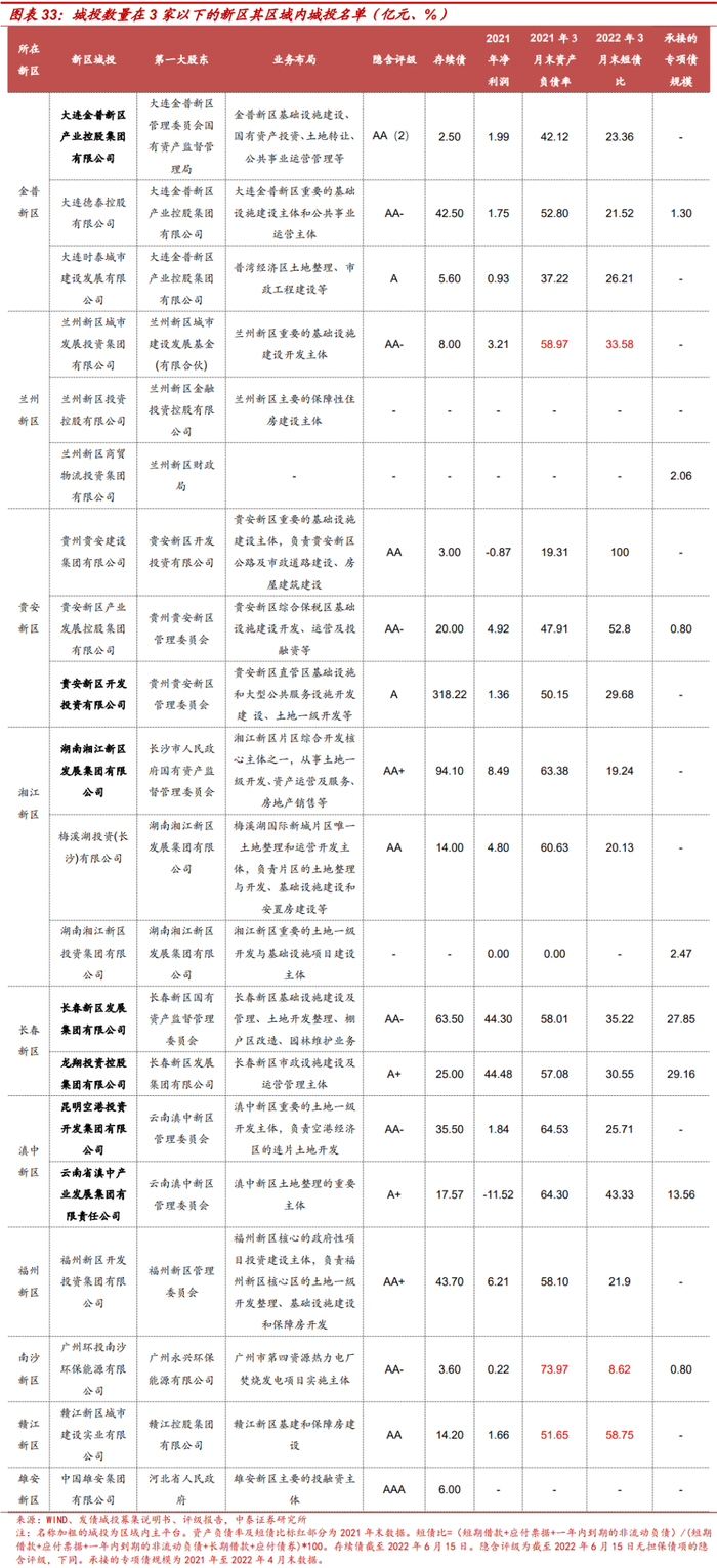 根据城投的业务范围及控股股东,我们共筛选出96家发债城投,筛选过程中,对于涉及新区范围内部分区域公益性业务、但其控股股东或实际控制人为所在行政区政府的城投,未将其列为新区城投。