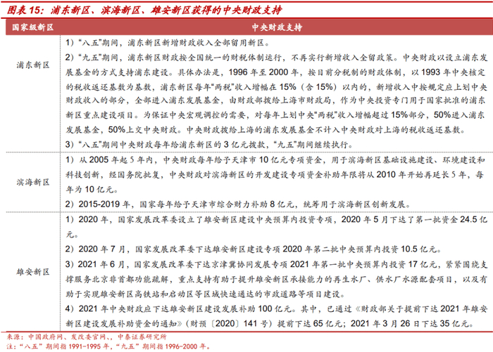 浦东新区、滨海新区成立之初得到来自中央财政、省级财政的双重支持。中央财政给予浦东新区的支持主要包括“八五”期间财政收入全留新区、“九五”期间增量税收进入浦东发展基金,支持浦东新区发展,以及连续10年每年的3亿元拨款。中央财政给予滨海新区的支持主要为财政资金支持,2005-2014年每年10亿元补助,2015-2019年每年8亿元补助。此外,雄安新区作为疏解北京非首都功能集中承载地,正处于起步阶段,获得较大规模的中央财政支持。