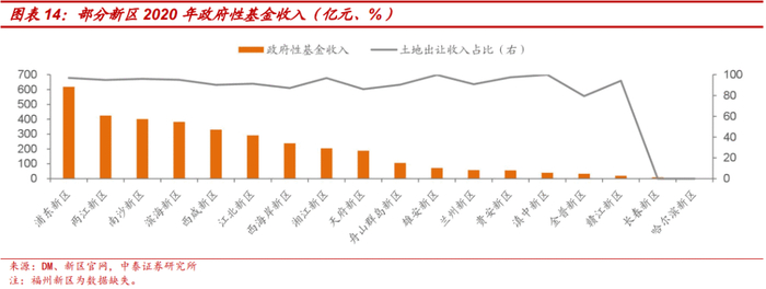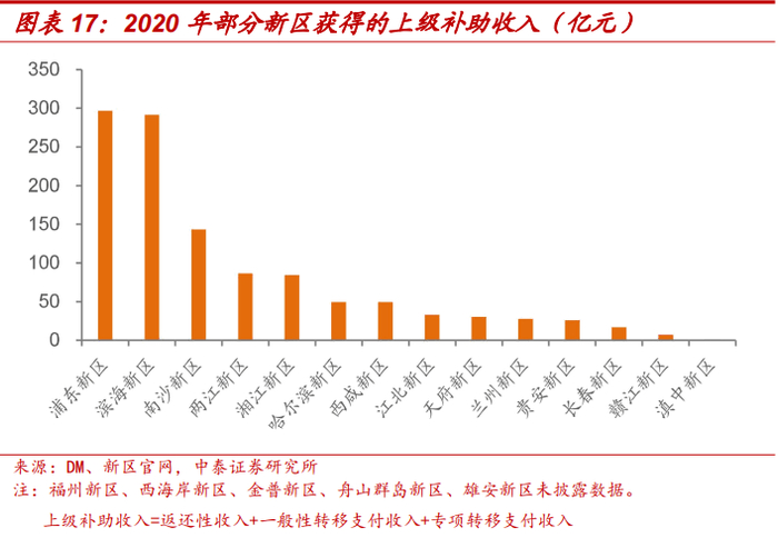 上级政府支持主要包括中央政府、省级/市级政府的财政资金补助等。成立较早的新区,例如浦东新区、滨海新区等中央政府补助较多,成立较迟的新区一般以省级/市级政府补助为主。