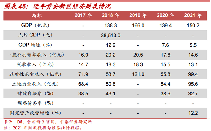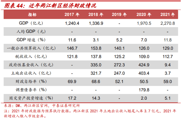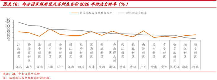 上级政府支持:政府支持主要包括财政资金支持、产业扶持、地方政府债支持。随着新区发展逐渐成熟,结合国办发20号文,财政资金支持或将逐渐退坡,新区面临后续开发建设以及债务偿还压力,同时也面临给上级政府提供财力支持的压力。比如2018-2020年贵安新区需上缴异地扶贫搬迁指标款56亿元,贵州省对贵安新区一直处于超调资金状态。两江新区2021年起政府性基金收入上缴市级金库。
