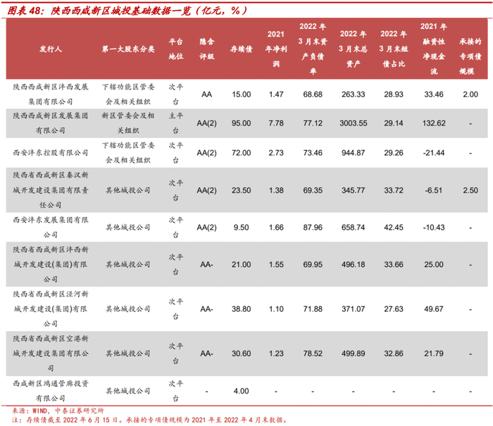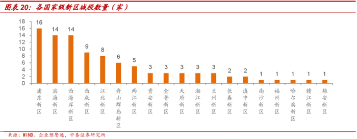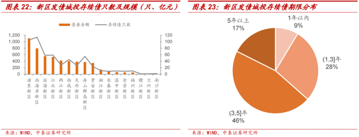 浦东新区、滨海新区、西海岸新区发债城投数量较多,与其成立时间久、区域范围大、辖内功能区多等有关;西海岸新区下辖功能区众多,每个功能区几乎都有自己的城投,因此数量较多;西咸新区划分沣东新城、沣西新城等5个新城,各个新城都有自己的城投,因此城投数量也较多。
