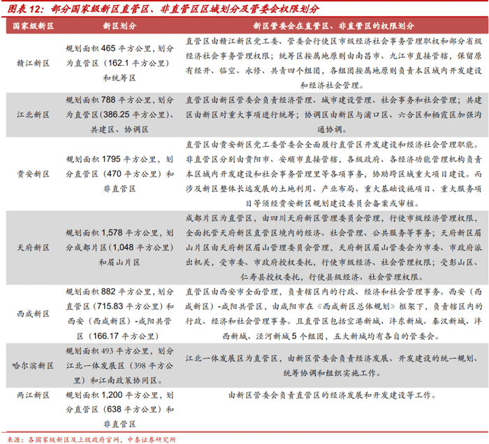 部分管委会型新区内划分直管区和非直管区。诸如赣江新区、江北新区、贵安新区、天府新区、西咸新区等都划分了直管区和非直管区,新区管委会在直管区范围内行使经济社会事务管理职权,非直管区遵循属地原则,新区管委会在经济社会发展重大事项上与非直管区所在行政区政府加强沟通。