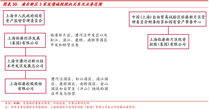 各个新区城投控股股东各有特色。政府型的浦东新区,新区城投实际控制人以上海市浦东新区人民政府国有资产监督管理委员会(以下简称“浦东新区国资委”)为主。16家城投中,13家城投的实际控制人为浦东新区国资委,浦东新区国资委直接控股的发债城投共5家,分别为上海浦东发展(集团)有限公司、上海浦东开发(集团)有限公司、上海张江(集团)有限公司、上海金桥(集团)有限公司和上海南汇城乡建设开发投资总公司,其余8家为城投的子公司。此外,上海临港经济发展(集团)有限公司和上海临港新片区投资控股(集团)有限公司分别由上海市国资委和临港片区管委会直接控股。