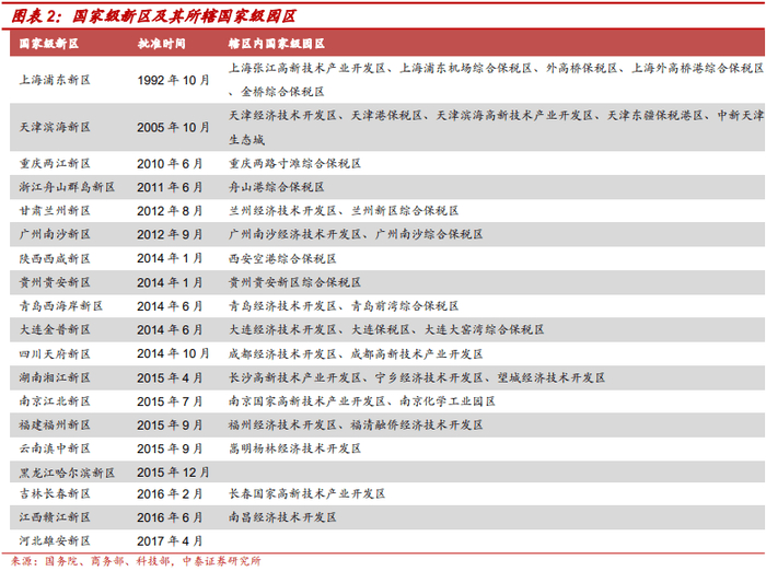 新区的设立往往伴随行政区域的重新划分,许多原有的国家级园区也划入到新区内,例如浦东新区辖区范围内包括上海张江高新技术开发区,滨海新区内包含天津经开区、天津滨海高新区两个原有的国家级园区,湘江新区覆盖长沙高新区、宁乡经开区和望城经开区3个国家级园区。目前新区内一般普遍设有国家级高新区、国家级经开区等,新区带来的经济要素聚集和政策支持有利于撬动资本和人才两大要素推动原有开发区转型。