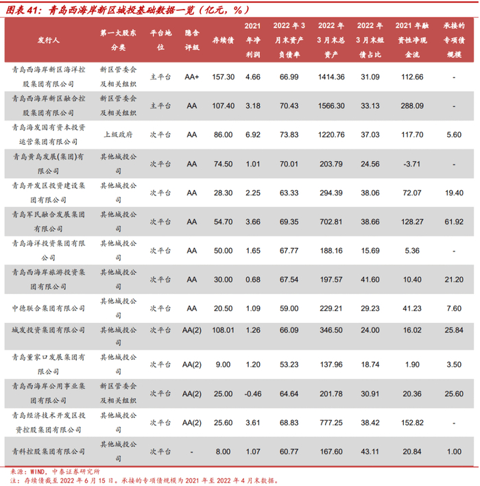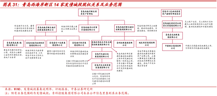 西海岸新区下辖青岛经济技术开发区、青岛前湾港保税区、青岛市董家口循环经济示范区、青岛国际经济合作区(中德生态园)、青岛古镇口军民融合创新示范区、青岛灵山湾影视文化产业区、青岛西海岸国际旅游度假区、海洋高新区(含中央活力区)、现代农业示范区和青岛西海岸交通商务区等10个功能区,各个功能区几乎都有自己相应的融资平台。不过14家发债城投的实际控制人仅青岛西海岸新区国有资产管理局和青岛市人民政府国有资产监督管理委员会,两个实际控制人直接持股的城投共有4家,城投子公司同在市场发行债券现象较为普遍。