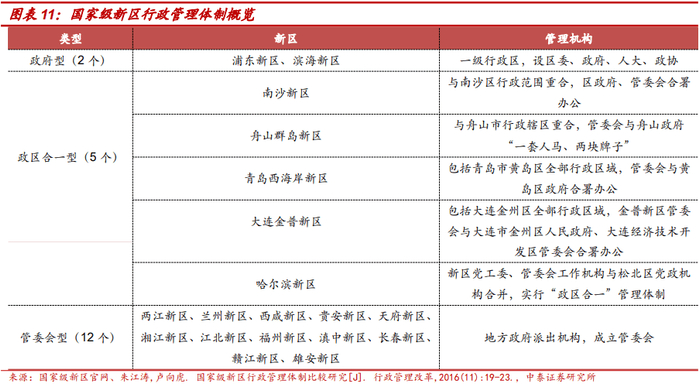 新区行政级别及行政管理体制:根据新区党工委书记兼任情况判断,浦东新区、滨海新区等7个为副省级新区,其余均为正厅级新区。新区行政管理体制主要分为政府型、政区合一型和管委会型三类。其中浦东新区和滨海新区建立了区委、区人大、区政府、区政协的管理机构;舟山群岛新区、南沙新区、西海岸新区、金普新区和哈尔滨新区5个新区为政区合一型;其余12个新区为管委会型。