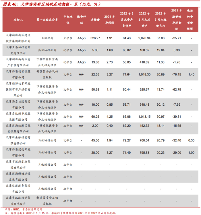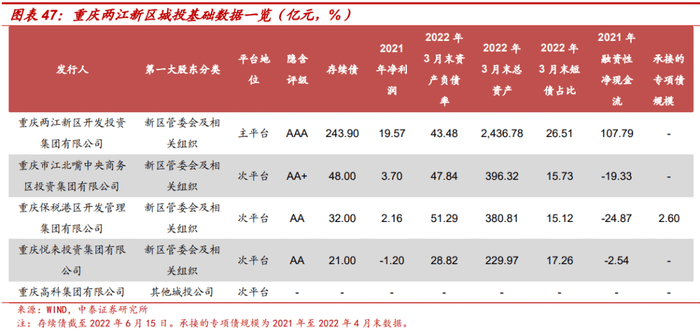 不过滨海新区、贵安新区所处的天津市、贵州省政府对地方债务风险有较强的管控意识,天津于2021年6月23日、2022年3月8日召开了债券市场投资人恳谈会、国企与金融机构恳谈会;国务院于2022年1月发布《国务院关于支持贵州在新时代西部大开发上闯新路的意见》(国发〔2022〕2号) 提及“防范化解债务风险”以及贵州金融机构贯彻落实新国发2号文件,对政信类资产业务阶段性延本延息、增加隐性债务置换额度等。综合新区及其所在省份经济财政情况、政府偿债意愿等,建议对滨海新区、两江新区城投可适当下沉,博取超额收益,贵安新区以主平台为主。