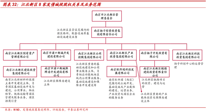 江北新区8家城投的实际控制人均为江北新区管委会,且江北新区管委会仅直接控股南京扬子国资投资集团有限责任公司1家城投,其他7家城投均为南京扬子国资投资集团有限责任公司的子公司。