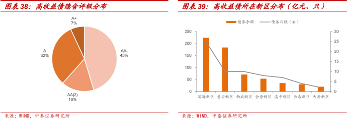 我们剔除存续债中剩余期限小于0.25年或大于3年、永续债、未披露中债行权收益率的债券,获得299个样本券。将中债行权收益率在6%以上的债券定义为高收益债,样本券中高收益债有66只,占比22.07%,债券余额占比23.83%。高收益债以中低评级债券为主,AA(2) 、AA-占比分别为16%和45%;主要分布于滨海新区、贵安新区,债券余额占比分别为43.55%和26.57%。具体城投来看,天津滨海新区建设投资集团有限公司、贵安新区开发投资有限公司、大连德泰控股有限公司的高收益债较多,分别为14只、10只和6只。