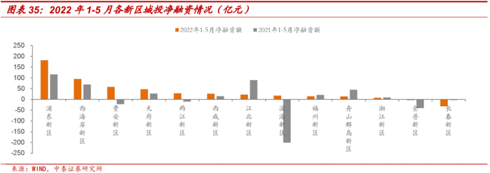 2022年1-5月,新区城投共发行105只债券,募集资金1,013.35亿元,同比增长35.34%。净融资额476.08亿元,同比增加375.97亿元。浦东新区、西海岸新区、天府新区、西咸新区为净融资流入,且较去年同期,净流入规模有所增长,贵安新区、两江新区以及滨海新区由净偿还转为净融资流入。长春新区净偿还规模较大。