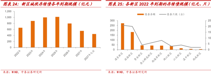新区城投债券到期偿还压力主要集中在未来5年内,2022年、2023年到期债券规模分别为654.96亿元、880.90亿元,其中浦东新区、滨海新区债券到期规模相对较大。