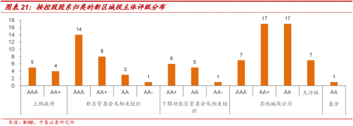 剔除无评级的7家城投外,AAA、AA+、AA和AA-城投分别有26家、35家、26家和2家。其中控股股东为上级政府、新区管委会及相关组织的城投以AAA和AA+为主,控股股东为下辖功能区管委会及相关组织、其他城投公司的以AA+和AA为主。