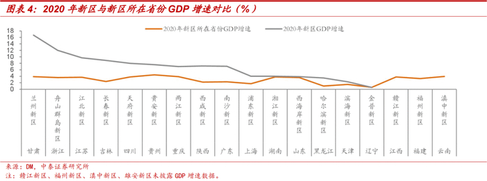 2020年,兰州新区、舟山群岛新区、江北新区、长春新区、天府新区GDP增速超过8%。除金普新区与所在辽宁省GDP增速基本一致外,其他新区GDP增速普遍高于新区所在省份GDP增速。