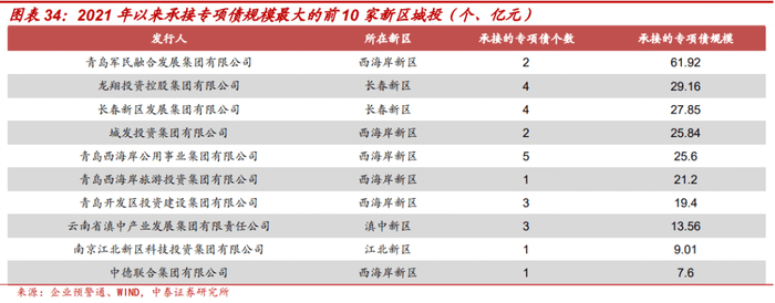 前文提到,上级政府对新区支持包括地方政府债券支持,对于新区符合条件的重大项目,上级政府在安排新增地方债额度方面予以倾斜。2021年至2022年4月末,共有27家新区城投承接了专项债项目。西海岸新区的青岛军民融合发展集团有限公司、城发投资集团有限公司、青岛西海岸公用事业集团有限公司、青岛西海岸旅游投资集团有限公司、青岛开发区投资建设集团有限公司,长春新区的龙翔投资控股集团有限公司、长春新区发展集团有限公司等获得的专项债规模较大。