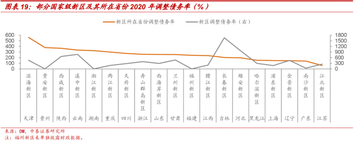 从债务压力看,2020年,长春新区、滇中新区、西咸新区、兰州新区、滨海新区、金普新区、哈尔滨新区调整债务率超过400%,且滨海新区、西咸新区、滇中新区所在省份债务压力也较重,天津、陕西、云南调整债务率分别为560.53%、379.02%和366.51%。