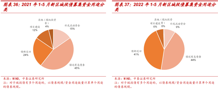今年1-5月,新区城投债募集资金用途仍以偿还有息债务为主,不过,新区城投债用于借新还旧(债券)的比例由24%大幅上升至41%,补充流动资金比例由15%下降至9%。新区部分城投可能和其他城投一样,受相关融资政策的约束。