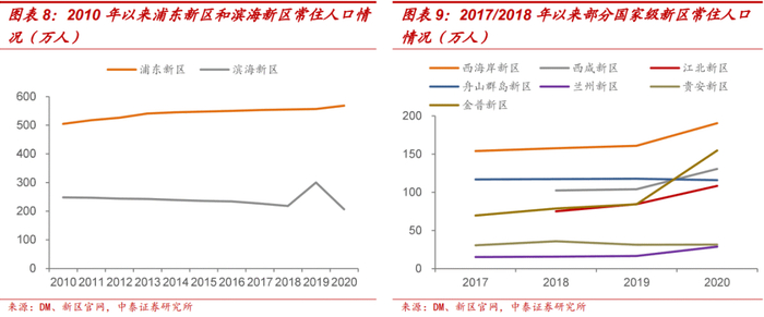 2010年以来,浦东新区人口整体呈流入状态,2020年人口数为568.15万人,较2010年增长12.57%。滨海新区除2019年人口同比增幅明显外,2010年以来的趋势整体向下,2020年人口数为206.73万人,较2010年下降16.73%。自2017/2018年以来,西海岸新区、西咸新区、金普新区和江北新区人口明显流入,但兰州新区人口流入较为缓慢,贵安新区、舟山群岛新区有人口流出迹象,未看到新区的人口虹吸力。