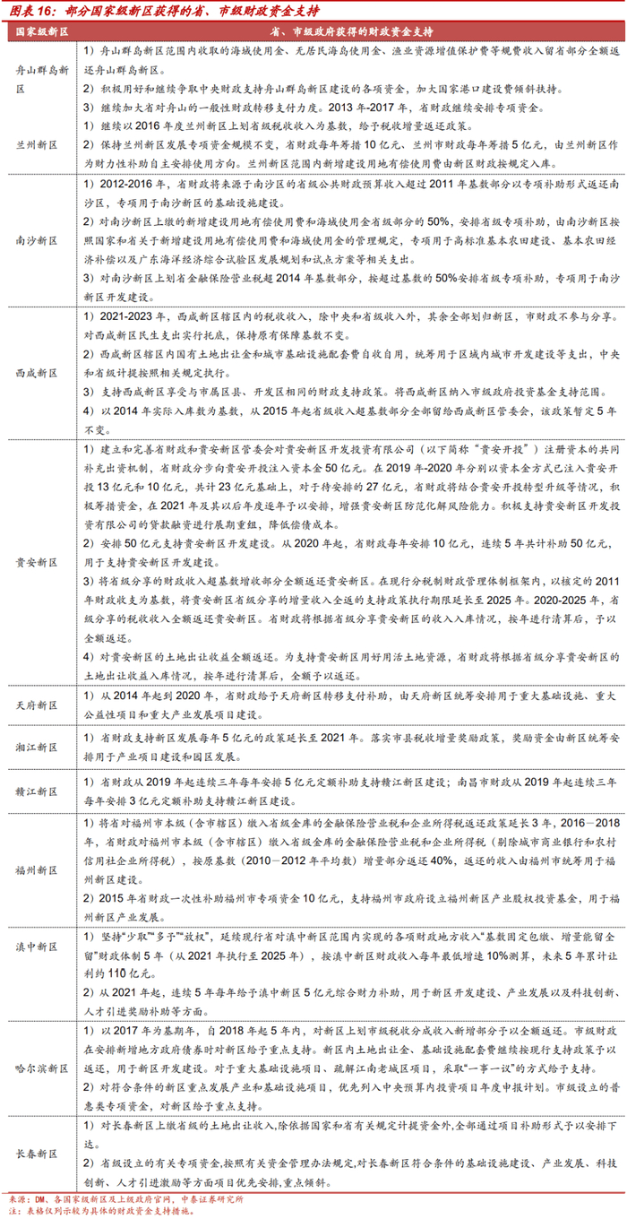 后续成立的新区以省级/市级政府支持为主,补助主要包括税收返还、土地出让收入返还、专项补助等财政资金支持、成立产业基金等产业扶持、提供地方政府债券额度倾斜等地方政府债支持三个方面。财政资金支持方面,上级政府一般会按照“保基数、分增量”的原则给予新区税收返还、专项补助等财政支持,支持新区基础设施等开发建设。图表16为列示的公开披露的最新的省、市级政府对新区的财政资金支持,部分新区的财政资金支持期限已经到期或即将到期。
