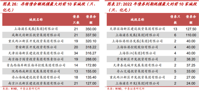 具体来看,上海浦东发展(集团)有限公司、成都天府新区投资集团有限公司等存续债余额规模较大,2022年债券到期规模较大的城投包括天津滨海新区建设投资集团有限公司、上海浦东发展(集团)有限公司等。