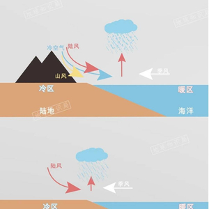 当季风迎面遇到山谷风和海陆风,就会被迫抬升触发降水(夜晚示意)(参考:华南海陆风日变化及其相关降水)▼