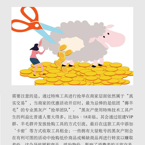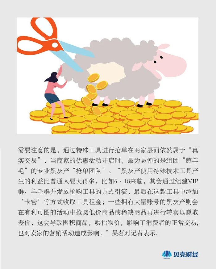 “黑灰产使用特殊技术工具产生的利益比普通人要大得多,比如6·18来临,其会通过组建VIP群、羊毛群并发放抢购工具的方式引流,最后在这款工具中添加‘卡密’等方式收取工具租金;一些拥有大量账号的黑灰产则会在有利可图的活动中抢购低价商品或稀缺商品再进行转卖以赚取差价,这会导致囤积商品,哄抬物价,影响了消费者的正常交易,也对卖家的营销活动造成影响。”吴茗对记者表示。