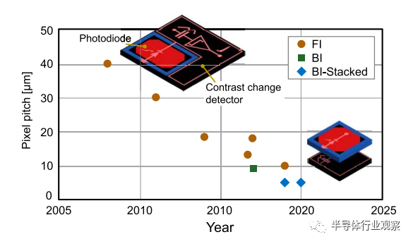 基于事件的视觉传感器 (EVS) 检测超过预设相对阈值的单个像素时间对比度,以跟踪相对光变化的时间演变,并为绝对强度的无帧像素级测量定义采样点。自 2006 年首次报告 EVS以来,已经提出了许多使用 EVS 的应用,例如由于记录数据的时间精度导致的高速低功耗机器视觉、对时间冗余的固有抑制导致减少后处理成本和广泛的场景内 DR 操作 。尽管像素尺寸在 2019 年通过 BI 结构减小到 9 µm 的间距,但由于大量像素级模拟信号处理,EVS 遭受了大像素尺寸和通常小分辨率的困扰。因此,EVS 特别受益于具有像素级 Cu-Cu 连接的堆叠器件结构的进步。