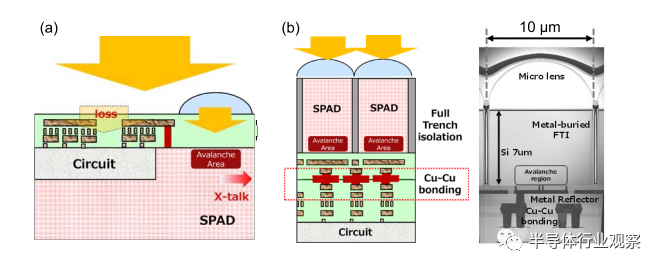 图 16. SPAD 器件结构。(a) FI SPAD。(b) BI-stacked SPAD。