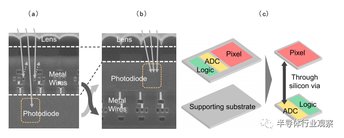 图 1. CMOS 图像传感器的结构。(a) FI 结构,(b) BI 结构,和(c)具有通孔的堆叠结构。