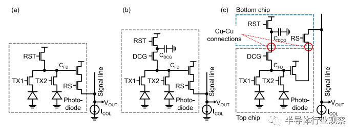 图 9. 像素电路配置 (a) 具有单转换增益,(b) 具有双转换增益,以及 (c) 具有双转换增益并堆叠像素平行 Cu-Cu 连接。