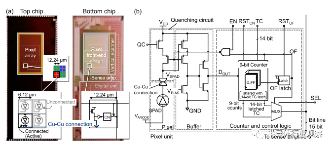 光子计数成像,也称为量子成像,是一种实现具有无噪声读出和 高动态范围成像(HDR) 的图像捕获的有前途的技术。使用单光子雪崩二极管 (SPAD) 的光子计数图像传感器是通过堆叠技术实现像素并行数字化的挑战之一。雪崩电流由单个光电子触发,在没有来自模拟前端电路的任何噪声的情况下,该事件可以数字化地视为光子计数。这需要为每个 SPAD 实现复杂的电路;而具有像素连接的堆叠器件结构具有高度集成的光子计数成像的潜力。