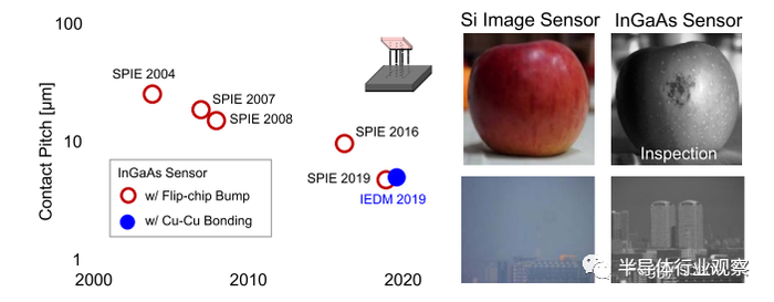图 22. 倒装凸块接触间距趋势和 Cu-Cu 键合以及 InGaAs 传感器的应用实例。