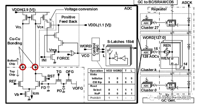 自 2001 年提出像素并行数字化概念以来,也提出了具有混合键合工艺的像素平行 Cu-Cu 连接的堆叠图像传感器。复杂电路中的像素内区域开销(within-pixel area overheads)绝对限制了像素分辨率,但 2017 年提出了具有阵列并行 ADC 架构的 410 万像素堆叠图像传感器,接着2018年提出了具有 146 万像素并行ADC的堆叠图像传感器 。由于混合键合工艺的细间距 Cu-Cu 连接,像素并行 ADC 架构已经实现了 Mpixel 分辨率。如图 11 所示,单斜率 ADC 用于像素并行和传统列并行架构,但没有源跟随器电路。像素内晶体管放大器直接集成在比较器中,通过两个 Cu-Cu 连接将每个像素连接到底部芯片。由于计数器的面积限制,格雷码被分配到像素内(in-pixel)的锁存器,数字读出管道(digital readout pipelines)已经使用像素阵列下的 ADC 实现。