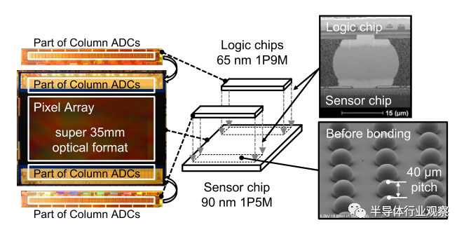 2016 年报道了一种使用 CoW 键合工艺的堆叠 CMOS 图像传感器[12],实现了具有超 35 毫米光学格式(optical format)的广播摄像机的全局快门图像传感器。在这里,两个切开的逻辑芯片采用 65-nm CMOS 工艺设计,具有并行 ADC 和微凸块(microbumps),并堆叠在为全局快门像素定制设计的大型传感器芯片上,如图 6 所示。具有高纵横比的切开的逻辑芯片通过间距为 40 µm 的微凸块连接到传感器。因此,连接总数约为 38 000。该传感器还允许通过 800 万像素以 480 fps 的速度进行超慢动作回放。