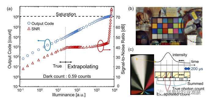图 15. 光子计数的测量结果。(a) 动态范围和信噪比。(b) 捕获的 HDR 图像。(c) 具有运动伪影抑制的捕获图像。