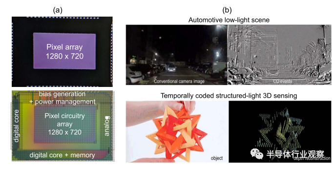 图 19. BI-stacked EVS 及其应用示例。(a) 芯片显微照片。(b) 应用实例。