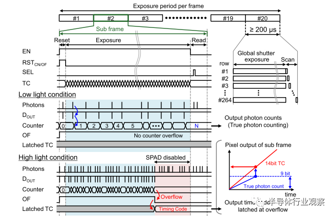 2021 年报道了一种动态范围为 124 dB 并使用子帧外推架构(subframe extrapolating architecture)的 SPAD 光子计数图像传感器 。一个背照式( BI) 单光子雪崩二极管(SPAD )像素阵列堆叠在底部芯片上,读出电路通过像素平行的 Cu-Cu 连接,如图 13(a) 所示。图13(b)是像素单元的简图。每个像素都有一个 9-b 数字纹波计数器 (CN),用于计算入射光子的数量。来自计数器的溢出进位 (OF) 返回到淬灭电路以控制 SPAD 激活并锁存时序代码 (TC)。然后将 14-b时序代码 (TC) 分配给所有像素,并在 OF 标志发生变化时覆盖计数器,如图 14 的时序图所示。读出光子的 9-b 计数或锁存的 14-b TC,并且在弱光条件下准确获得所有光子计数,而不会出现计数器溢出。但是,当计数器在高光条件下溢出时,溢出像素会记录时间,并外推整个曝光期间的实际入射光子数。