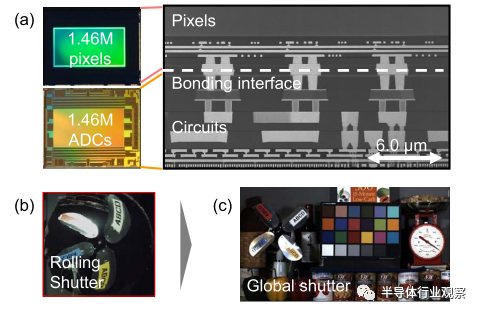 图 12. 像素并行 ADC 的芯片实现。(a) 芯片显微照片。(b) 使用滚动快门操作和 (c) 使用全局快门操作捕获的图像。