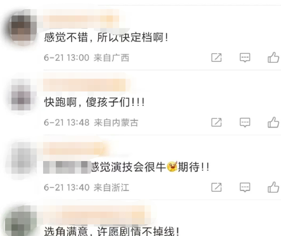 这样的预告片一出,很多网友看了以后,纷纷留言表示很期待。有的说“选角可以,太对味了,请速速定档!”、“感觉演技会很牛,期待!”、“选角满意,许愿剧情不掉线”等等。