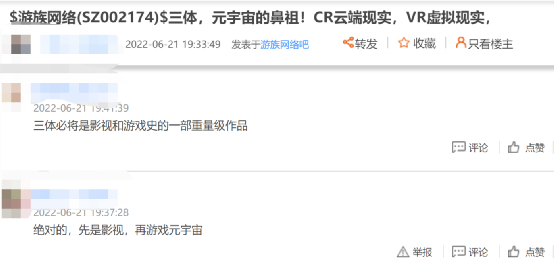 游族网络股价今年在一路震荡下跌后,周二罕见出现涨停,报收10.10元/股,最新总市值为93亿元。今日早盘,游族网络一度涨超6%,截至发稿,涨超3%。网友在游族网络的股吧里围绕《三体》也聊得很热闹,“三体必将是影视和游戏史的一部重量级作品”。