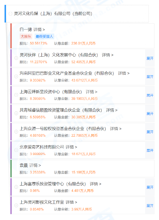 还有一家灵河文化,也是近年来影视行业的一颗明星,其曾经出品制作了《老九门》《鬼吹灯》《盗墓笔记》等影视作品。从股权结构来看,灵河文化的大股东是编剧白一骢,此外阿里巴巴影业文化产业基金、上海云锋新呈投资中心、北京爱奇艺科技等多家公司也投资了灵河文化。