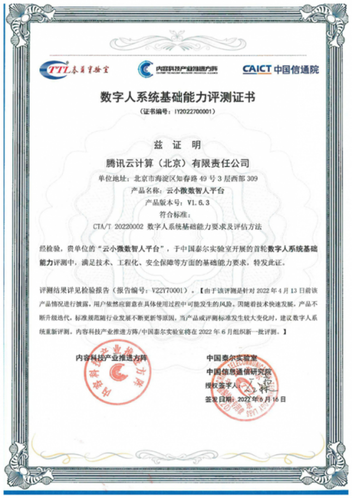 权威认证!腾讯云小微数智人平台通过信通院首批数字人系统基础能力评测