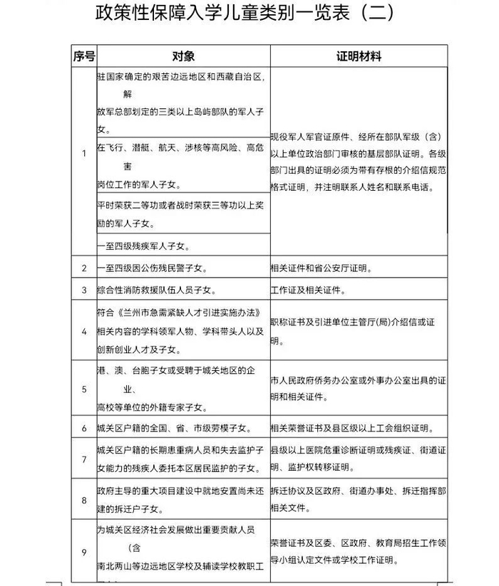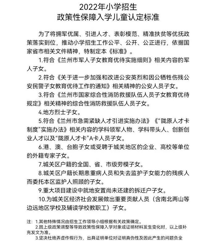 2.符合《2022年兰州市城关区小学招生政策性保障入学儿童认定标准》的儿童。由其父母或其他法定监护人在城关区小学入学网络申请系统上提出申请,经教育集团、学校审核认定,可按顺序原则自主招生;区委、区政府或教育局认定的政策性保障入学儿童,根据学位空额情况统筹调配入学。