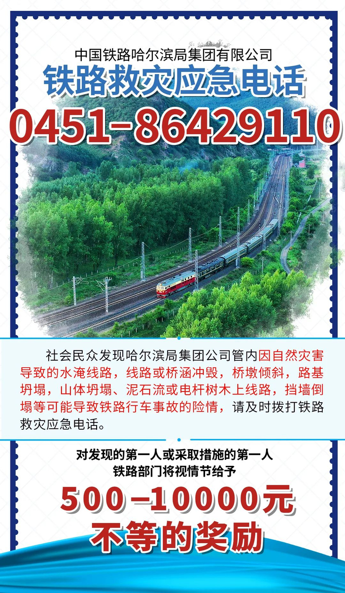 22日,记者从铁路部门获悉,中国铁路哈尔滨局集团有限公司公布铁路救灾应急电话。如发现哈铁管内因自然灾害导致水淹线路等情况,发现并报告或采取措施第一人,将获得500至万元不等奖励。