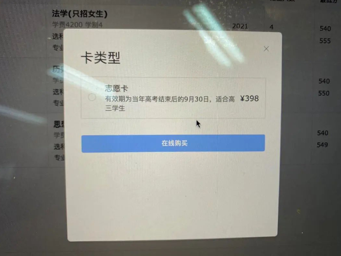 记者以山西应届考生身份在某志愿填报网站输入预估考试成绩之后,系统自动给出了全省估算排名,以及部分学校的录取概率,但如果想查看更多,就需要购买价格为398元的志愿填报卡。