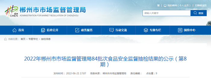 中国质量新闻网讯 6月21日,湖南省郴州市市场监管局网站公示2022年第8期食品安全监督抽检结果。本期抽检23批次食用农产品,1批次不合格、22批次合格。合格产品信息见下表。